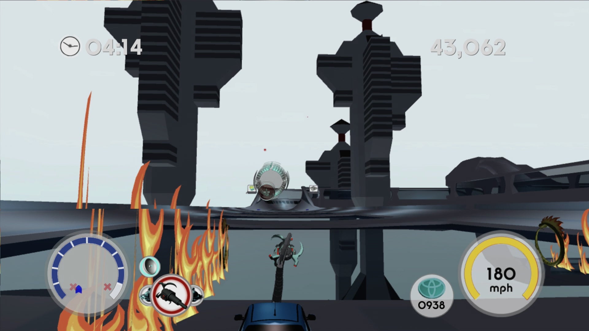 And those enemies. Christ on a bike, they either fly onto the screen from behind you and hover there waiting to be shot, or drive onto the screen from behind you and hover there waiting to be shot. Some of them might even occasionally leave an ugly, screen tearing trail of flame PNGs in their wake too. It’s all impossibly grotesque to look at and, unbelievably, it’s just as bad to listen to. Did the developers sample the Yaris’ engine noises perhaps, to give players a better understanding of the car and how it might perform in real life? Did they hell. Your Yaris is silent for the entire game. The only audio you can hear underneath Yaris’ selection of godawful looping soundtracks are the pathetically limp pew pews of whatever weapon your Yaris currently has equipped, the occasional damage sound effect when you run through a wall of flimsy flame effects and the flaccid wibble wibble wibble noise that the wrestlers make when you fire a laser bolt up their backside.