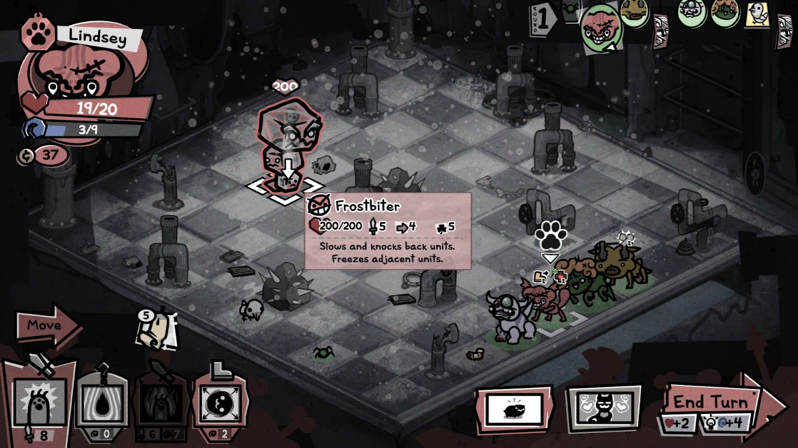 You finally arrive at a battle, and this is where Mewgenics gets bananas. You’re dropped onto a grid made up of squares on which you can move, attack, and generally cause mayhem. Your squad is placed down on one side, as are foes and miscellaneous junk, food, poo, etc. Early on these enemies are simple – fat rats, other cats, maggots, and flies. This so far is a gross-but-standard TRPG battle system, and should be of no surprise coming from McMillen himself.