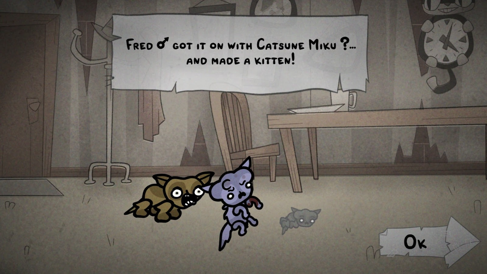 After ending the day, Fred and Catsune Miku have sex and a kitten is born. It inherits Miku’s burn boost passive, which is lovely. Miku can then be kept in your home base – a disgusting house filled with rancid cats – or sent off to one of many NPCs who will give you permanent unlocks, side quests, and other goodies in exchange. But it doesn’t have to go that way. Maybe Miku has twins, what a score! Maybe she’s asexual, or just doesn’t get on with Fred at all. Maybe she gets permanently disfigured in a fight with Fred, or maybe she’s just gay? All of these are possible, and all of these have significant consequences to how you approach your next excursion in Mewgenics.